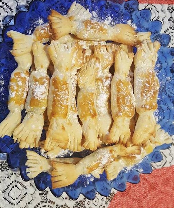 A tészta két végét összenyomjuk, hogy a formája hasonlítson egy csomagra, majd egy kicsit megcsavarjuk őket, hogy kéz formája alakuljon ki. Ha szeretnénk, a tészta széleit finoman formázhatjuk úgy, hogy egy-egy kis ujjat imitáljunk a csomagok végén.