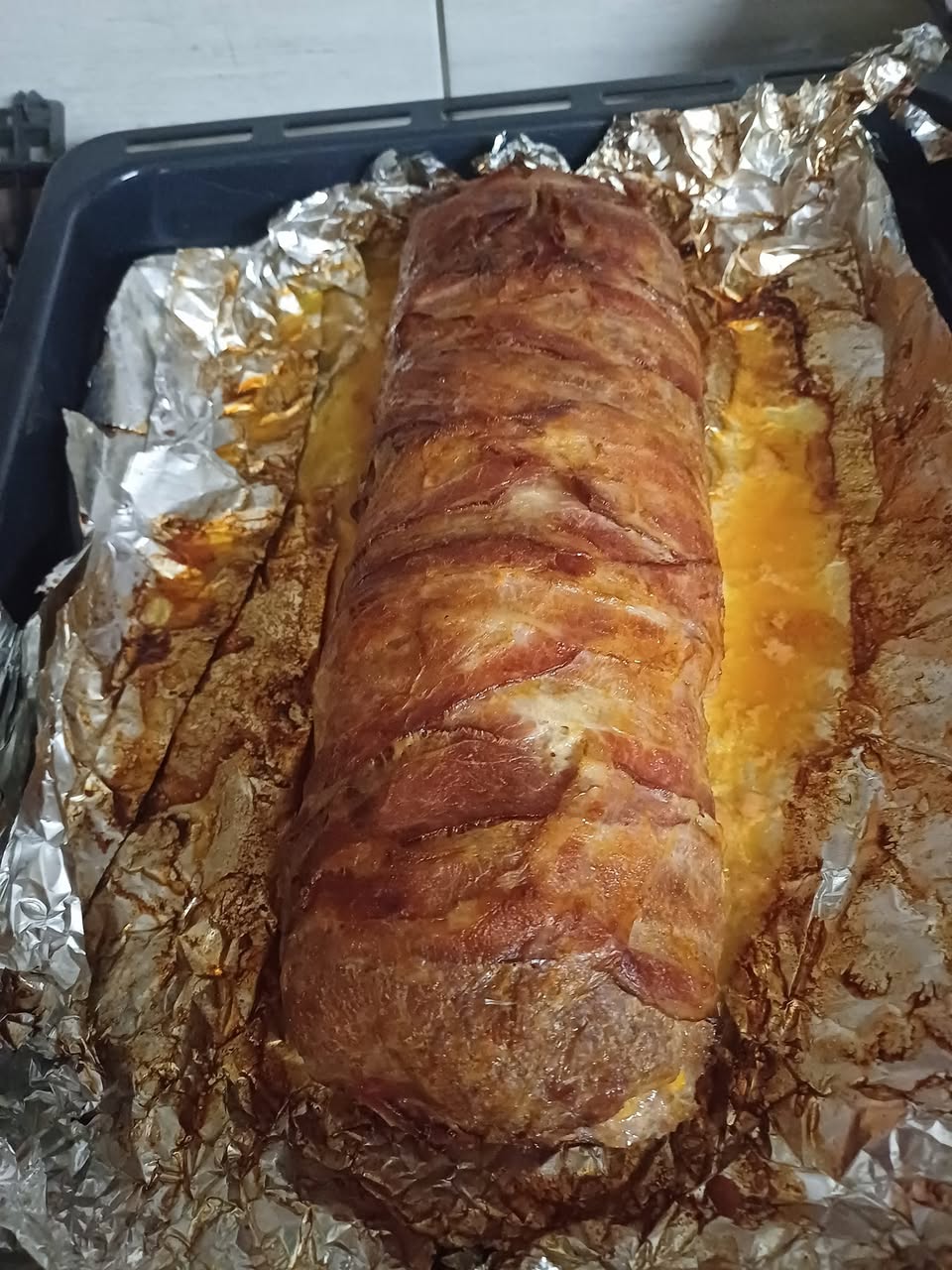 A kész tekercset helyezzük egy előmelegített 160 °C-os sütőbe, és süssük körülbelül 90 percig. Ezalatt a hús jól átsül, és a bacon szépen karamellizálódik. A sütési idő végén vegyük le róla az alufóliát, emeljük a hőmérsékletet 180 °C-ra, és további 15 percig pirítsuk, hogy a bacon szépen ropogósra süljön. Ekkor a hús kívül is, belül is csodálatosan szaftos lesz, miközben a bacon extra ízt és textúrát ad a tekercsnek.