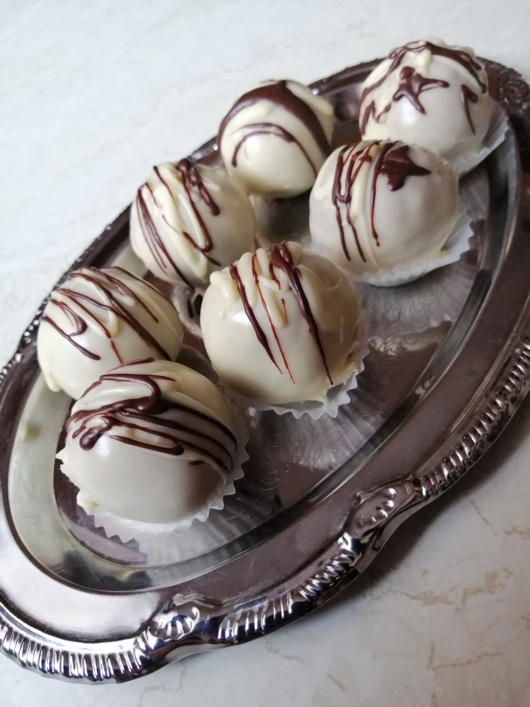 Amikor a csokoládé teljesen simára olvadt, kivesszük a megdermedt golyókat a fagyasztóból. Egy fogpiszkálót vagy hurkapálcát szúrunk a golyókba, majd egyenként megmártjuk őket az olvasztott fehércsokoládéban. Ügyeljünk arra, hogy minden oldalukat egyenletesen bevonja a csoki.