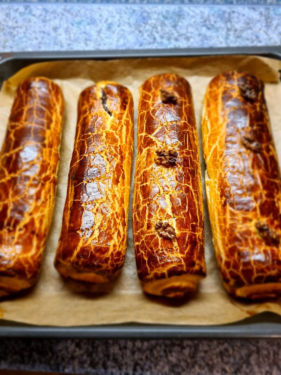 Ezután szorosan, de óvatosan feltekerjük a tésztát, majd a rudat sütőpapírral bélelt tepsire helyezzük. Ugyanezt a műveletet megismételjük a többi tésztadarabbal is, így összesen négy rúd bejglit kapunk.