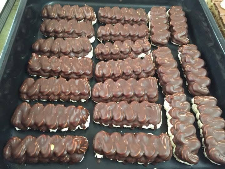 A kész krémet díszítocsovel ellátott habzsákba toltom s minden diós kiflire nyomom. Hutobe teszem dermedni majd olvasztott csokiba mártom a hideg krémet.