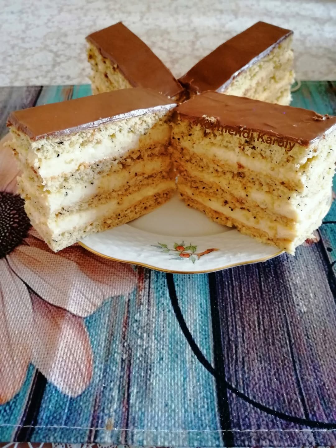 A kihűlt tésztalapok közé egyenletes rétegben kenjük a krémet. Ha szeretnénk, mind a négy lapot megkenhetjük, de akár csak három lapra is kerülhet a krém, attól függően, hogy mennyire dús szeletet szeretnénk. Miután a krém az összes lapra felkerült, az utolsó tésztalapot is rátesszük, és a tetejére egy sima felületet kapunk.
